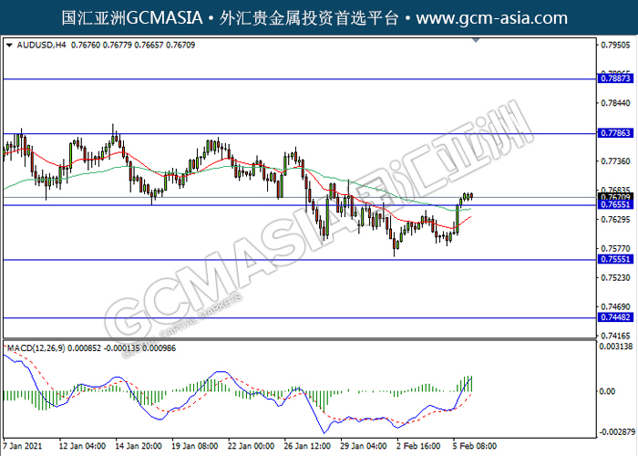 20210208 AUDUSD by willy | Feb 8, 2021 | 澳元兑美元 | 0 comments GCMAsia - AUDUSD AUDUSD 2021-02-08 AUDUSD,H4:澳美突破前期压力,多头排列。MACD动能持续略增,短期继续看多为主。上方关注0.7785压力和0.7885压力,下方关注0.7655支撑和0.7555支撑。
