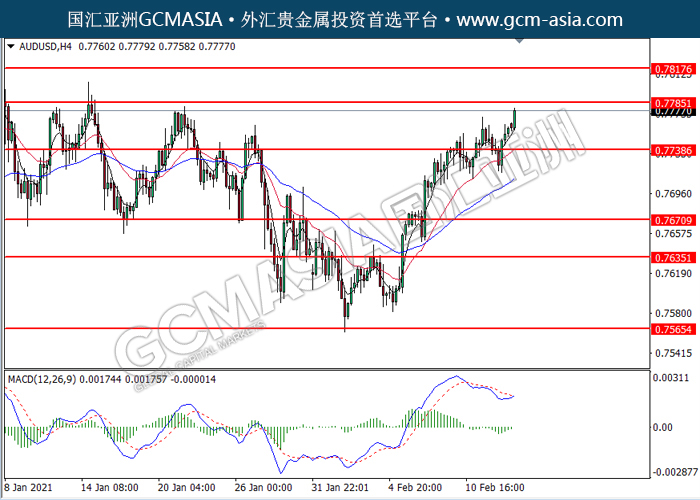 20210215 AUDUSD-午间 by willy | Feb 15, 2021 | 澳元兑美元 | 0 comments GCMAsia - AUDUSD AUDUSD 2021-02-15 AUDUSD,H4:澳美突破后持续上行。然而,MACD空头动能略减,短期可关注多头趋势为主。上方关注0.7785压力和0.7815压力,下方关注0.7740支撑和0.7670支撑。