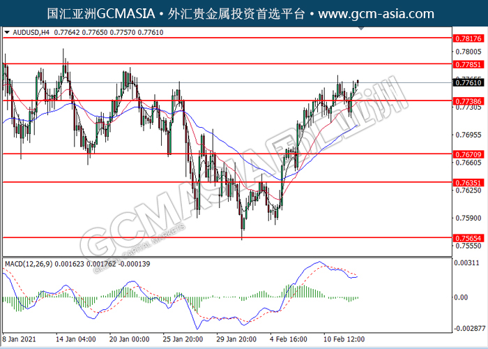 20210215 AUDUSD by willy | Feb 15, 2021 | 澳元兑美元 | 0 comments GCMAsia - AUDUSD AUDUSD 2021-02-15 AUDUSD,H4:澳美突破后持续上行。然而,MACD空头动能略减,短期可关注多头趋势为主。上方关注0.7785压力和0.7815压力,下方关注0.7740支撑和0.7670支撑。