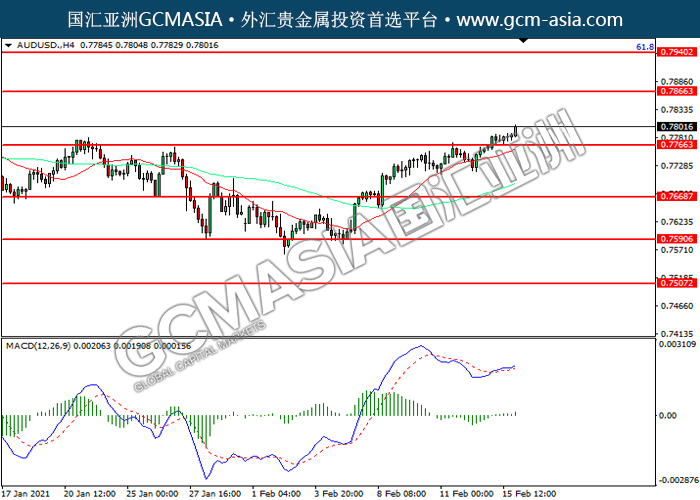AUDUSD,H4:澳美突破前期压力,震荡上行。MACD已形成金叉,动能转强,短期继续看多为主。上方关注0.7865压力和0.7940压力,下方关注0.7765支撑和0.7670支撑。