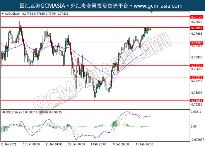 20210216 AUDUSD by willy | Feb 16, 2021 | 澳元兑美元 | 0 comments GCMAsia - AUDUSD AUDUSD 2021-02-16 AUDUSD,H4:澳美突破后持续上行。MACD多头动能偏强,若突破可关注多头趋势为主。上方关注0.7785压力和0.7815压力,下方关注0.7740支撑和0.7670支撑。