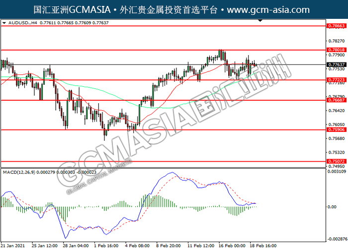 20210219 AUDUSD-午间 by keyk | Feb 19, 2021 | 澳元兑美元 | 0 comments GCMAsia-AUDUSD AUDUSD 2021-02-19 AUDUSD,H4:澳美震荡上行。MACD空头动能略减,短期继续看多为主。上方关注0.7800压力和0.7865压力,下方关注0.7720支撑和0.7670支撑。