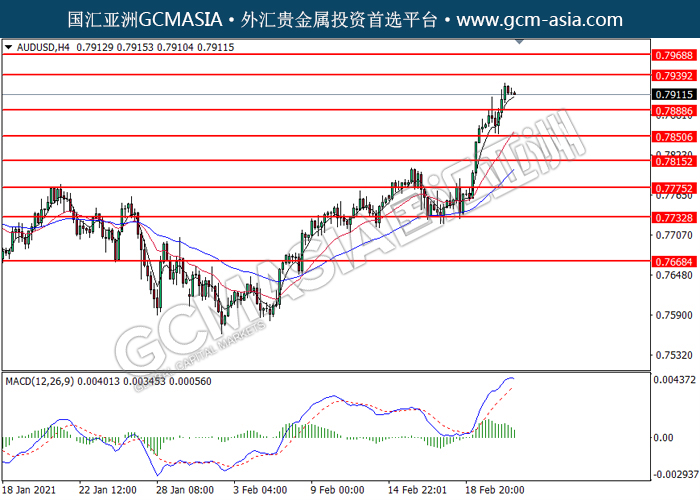 20210223 AUDUSD by willy | Feb 23, 2021 | 澳元兑美元 | 0 comments GCMAsia - AUDUSD AUDUSD 2021-02-23 AUDUSD,H4:澳美高位承压后回落。MACD多头动能略减,短期可关注空头趋势为主。上方关注0.7940压力和0.7970压力,下方关注0.7890支撑和0.7850支撑。