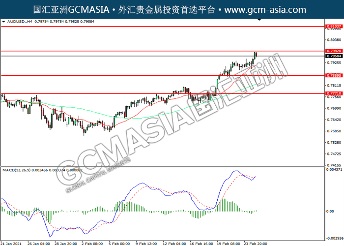 AUDUSD,H4:澳美震荡上行,目前测试前期压力。MACD空头动能略减,若突破可关注多头为主。上方关注0.7985压力和0.8105压力,下方关注0.7860支撑和0.7770支撑。