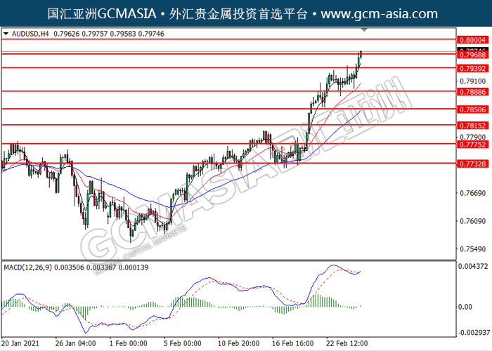 AUDUSD,H4:澳美突破后持续上行,目前测试着压力位。MACD多头动能略增,若成功收线在压力位上方可关注多头趋势为主。上方关注0.7970压力和0.8000压力,下方关注0.7940支撑和0.7890支撑。