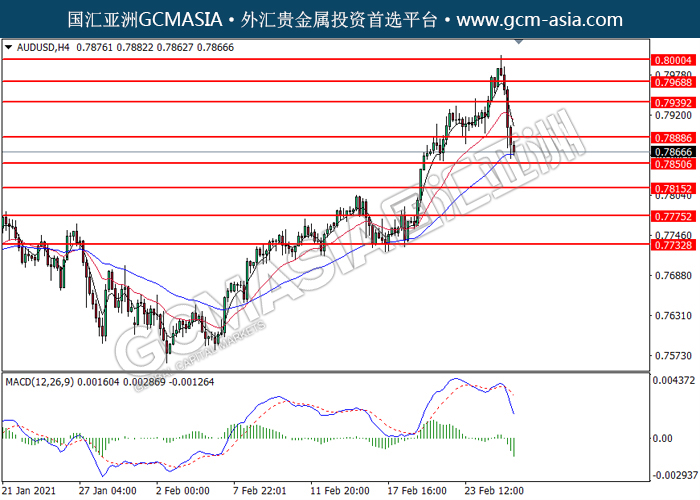 AUDUSD,H4:澳美突破后持续下行。MACD空头动能略增,短期关注空头趋势为主。上方关注0.7890压力和0.7940压力,下方关注0.7850支撑和0.7815支撑。