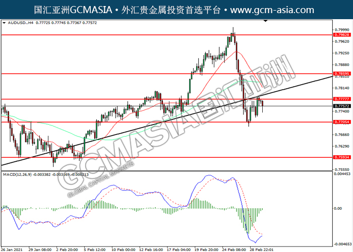 AUDUSD,H4:澳美震荡上行,目前测试前期压力。MACD空头动能略减,若突破可关注多头方向为主。上方关注0.7775压力和0.7860压力,下方关注0.7705支撑和0.7595支撑。