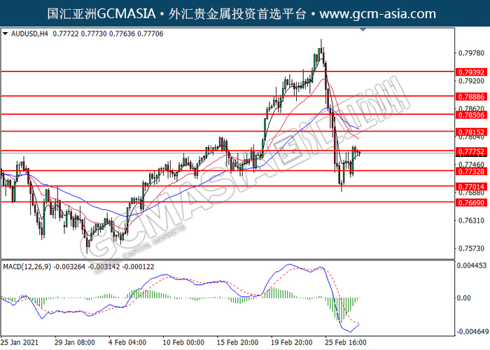 AUDUSD,H4:澳美突破后持续上行,目前测试着压力位。然而,MACD空头动能略减,若突破可关注多头趋势为主。上方关注0.7775压力和0.7815压力,下方关注0.7735支撑和0.7700支撑。