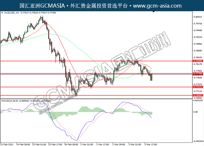 AUDUSD,H1:澳美震荡上行,目前测试前期压力。MACD空头动能略减,若突破可关注多头方向为主。上方关注0.7780压力和0.7830压力,下方关注0.7725支撑和0.7695支撑。