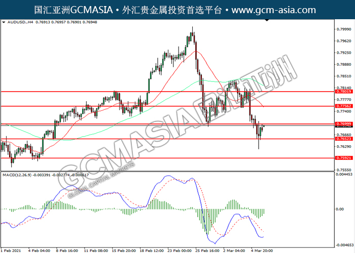 AUDUSD,H4:澳美震荡上行,目前测试前期压力。MACD空头动能略减,若突破可关注多头为主。上方关注0.7700压力和0.7755压力,下方关注0.7650支撑和0.7590支撑。