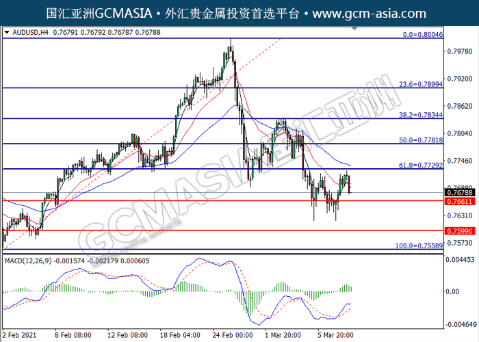 20210310 AUDUSD-午间 by keyk | Mar 10, 2021 | 澳元兑美元 | 0 comments GCMAsia-AUDUSD AUDUSD 2021-03-10 AUDUSD,H4:澳美高位承压后回落。MACD多头动能略减,短期可关注空头回调为主。上方关注0.7730压力和0.7780压力,下方关注0.7660支撑和0.7600支撑。