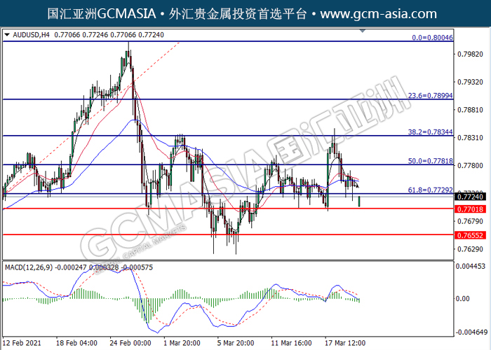 AUDUSD,H4:澳美突破后持续下行,目前测试着支撑位。MACD空头动能略增,若突破可关注空头趋势为主。上方关注0.7730压力和0.7780压力,下方关注0.7700支撑和0.7655支撑。