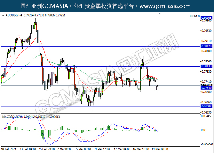 20210322 AUDUSD-午间 by keyk | Mar 22, 2021 | 澳元兑美元 | 0 comments GCMAsia-AUDUSD AUDUSD 2021-03-22 AUDUSD,H4:澳美空头排列,目前测试前期支撑。MACD动能持续略减,若突破继续看空。上方关注0.7805压力和0.7885压力,下方关注0.7715支撑和0.7640支撑。