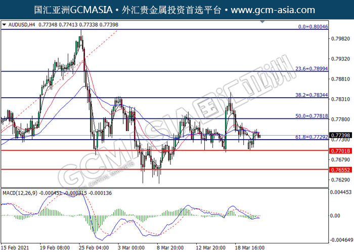 AUDUSD,H4:澳美高位承压后回落,目前测试着支撑位。MACD空头动能略增,若突破可关注空头趋势为主。上方关注0.7780压力和0.7835压力,下方关注0.7730支撑和0.7700支撑。