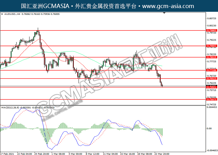 20210324 AUDUSD-午间 by keyk | Mar 24, 2021 | 澳元兑美元 | 0 comments GCMAsia-AUDUSD AUDUSD 2021-03-24 AUDUSD,H4:澳美空头排列,目前测试前期支撑。MACD空头动能略增,若突破继续看空。上方关注0.7650压力和0.7710压力,下方关注0.7590支撑和0.7505支撑。