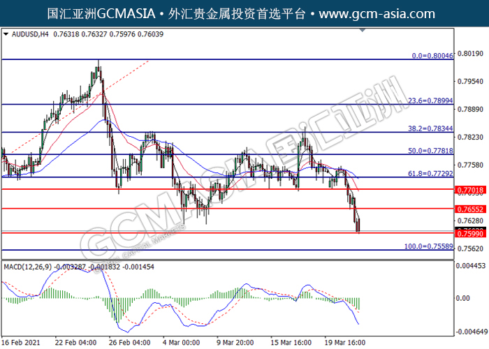 AUDUSD,H4:澳美突破后持续下行,目前测试着支撑位。MACD空头动能略增,若突破可关注空头趋势为主。上方关注0.7655压力和0.7700压力,下方关注0.7600支撑和0.7560支撑。