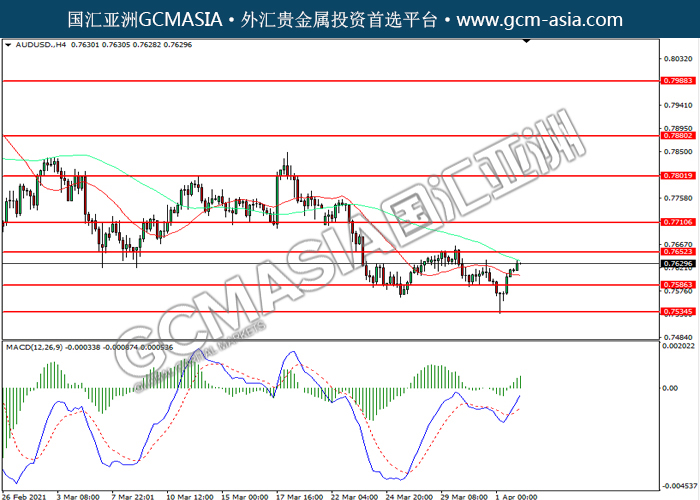 AUDUSD,H4:澳美震荡上行,目前靠近前期压力。MACD多头动能持续略增,若突破可关注多头为主。上方关注0.7650压力和0.7710压力,下方关注0.7585支撑和0.7535支撑。