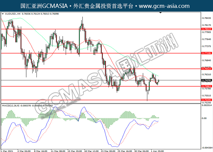 AUDUSD,H4:澳美震荡下行,目前靠近前期支撑。然而,MACD多头动能持续略,短期可关注技术性回调为主。上方关注0.7650压力和0.7710压力,下方关注0.7585支撑和0.7535支撑。