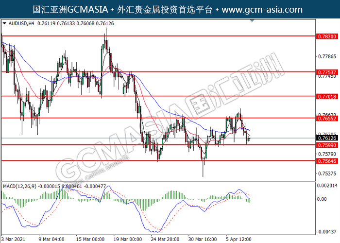 20210408 AUDUSD by willy | Apr 8, 2021 | 澳元兑美元 | 0 comments GCMAsia - AUDUSD AUDUSD 2021-04-08 AUDUSD,H4:澳美高位承压后回落。MACD空头动能略增,短期可关注空头趋势为主。上方关注0.7655压力和0.7700压力,下方关注0.7600支撑和0.7565支撑。