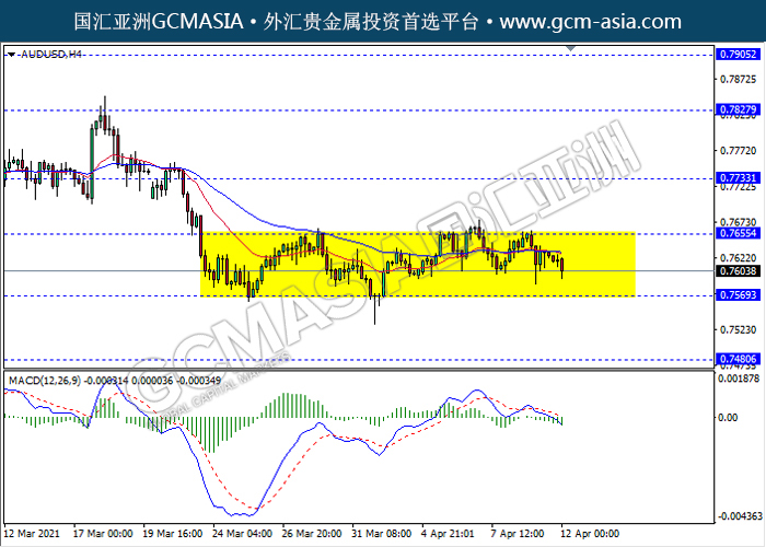 AUDUSD,H4:澳美仍区间交易,近期高位承压回落。然而,MACD动能略减,短期关注空头方向为主。上方关注0.7655压力和0.7735压力,下方关注0.7570支撑和0.7480支撑。