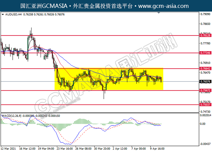 AUDUSD,H4:澳美高位承压后回落。MACD空头动能略增,短期可关注空头趋势为主。上方关注0.7665压力和0.7735压力,下方关注0.7565支撑和0.7505支撑。