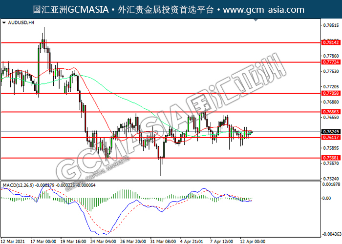 AUDUSD,H4:澳美高位回落,目前测试前期支撑。然而,MACD空头动能略减,短期可关注技术性回调为主。上方关注0.7665压力和0.7735压力,下方关注0.7610支撑和0.7570支撑。