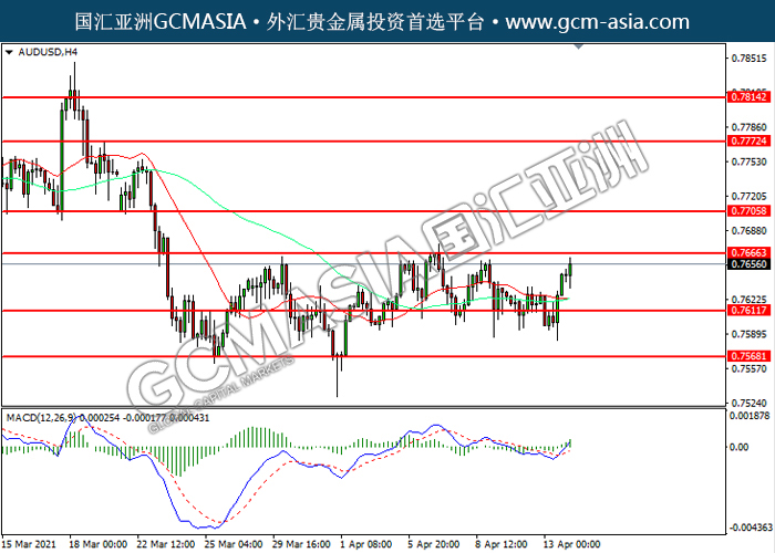 AUDUSD,H4:澳美震荡上行,目前测试前期压力。MACD多头动能略增,若突破可关注多头为主。上方关注0.7665压力和0.7705压力,下方关注0.7610支撑和0.7570支撑。