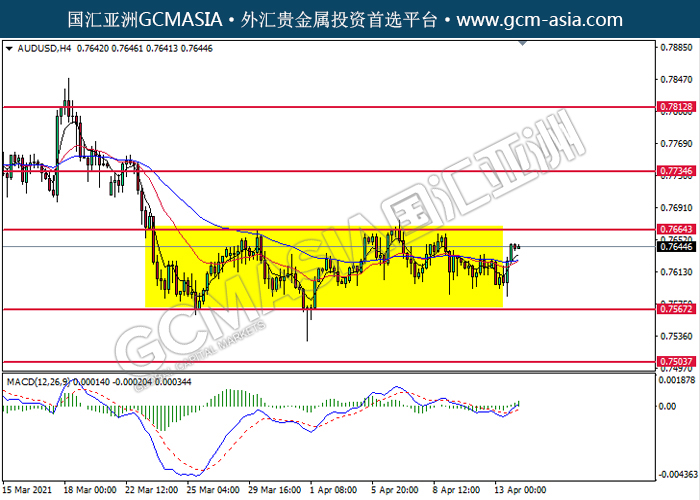 20210414 AUDUSD by willy | Apr 14, 2021 | 澳元兑美元 | 0 comments GCMAsia-AUDUSD AUDUSD 2021-04-14 AUDUSD,H4:澳美低位反弹。MACD多头动能略增,短期可关注多头趋势为主。上方关注0.7665压力和0.7735压力,下方关注0.7565支撑和0.7505支撑。