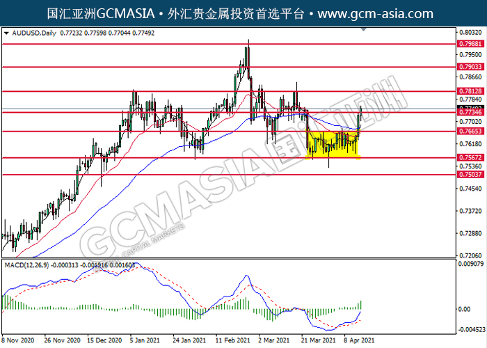 AUDUSD,Daily:澳美突破后持续上行,目前测试着压力位。MACD多头动能略增,若突破可关注多头趋势为主。上方关注0.7735压力和0.7815压力,下方关注0.7665支撑和0.7565支撑。