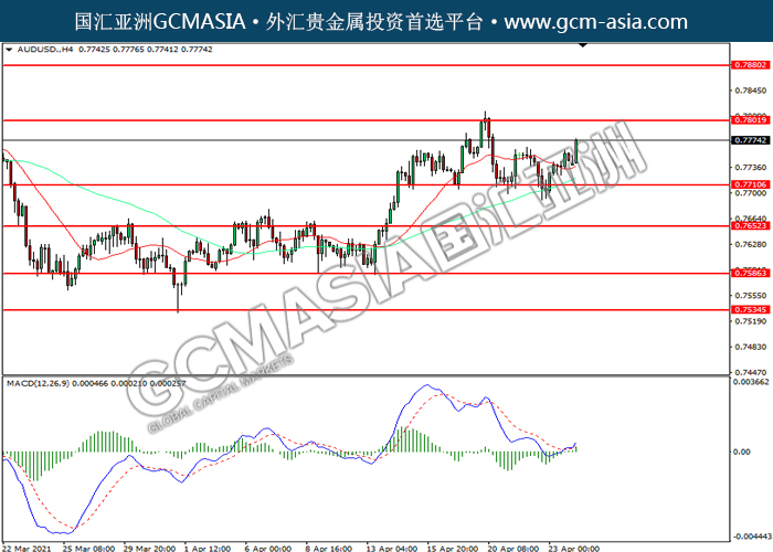 20210426 AUDUSD-午间 by willy | Apr 26, 2021 | 澳元兑美元 | 0 comments GCMAsia-AUDUSD AUDUSD 2021-04-26 AUDUSD,H4:澳美震荡上行。MACD已形成金叉,动能转强,若突破可关注多头为主。上方关注0.7800压力和0.7880压力,下方关注0.7710支撑和0.7660支撑。