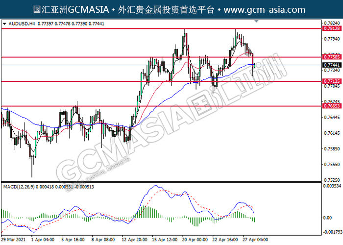 20210428 AUDUSD-午间 by willy | Apr 28, 2021 | 澳元兑美元 | 0 comments GCMAsia-AUDUSD AUDUSD 2021-04-28 AUDUSD,H4:澳美突破后持续下行。MACD空头信号,动能略减,若突破可关注空头趋势。上方关注0.7760压力和0.7815压力,下方关注0.7715支撑和0.7665支撑。