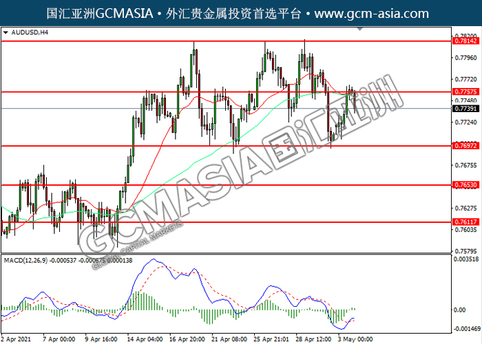 20210504 AUDUSD-午间 by keyk | May 4, 2021 | 澳元兑美元 | 0 comments GCMAsia-AUDUSD AUDUSD 2021-05-04 AUDUSD,H4:澳美高位承压回来。MACD多头动能略减,若突破可关注空头为主。上方关注0.7755压力和0.7815压力,下方关注0.7695支撑和0.7655支撑。