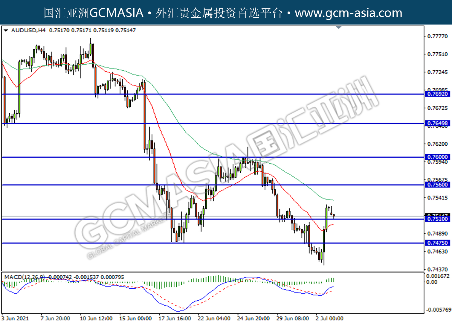 20210705-AUDUSD by willy | Jul 5, 2021 | 澳元兑美元 | 0 comments AUDUSD,H4:澳美受承压回落。MACD多头动能有所略减,若下破可继续看空。上方关注0.7560压力和0.7600压力,下方关注0.7510支撑和0.7475支撑。