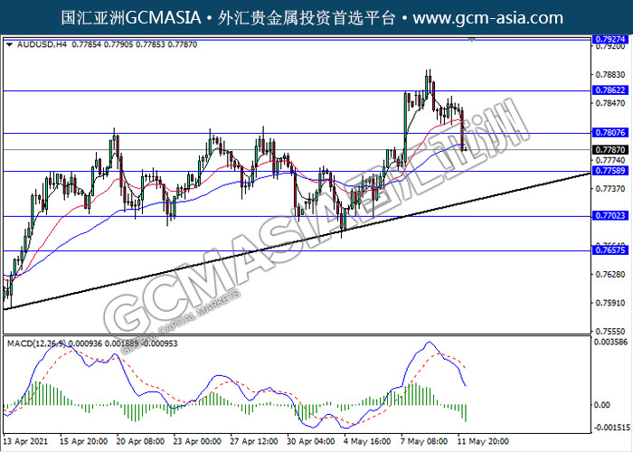 20210512 AUDUSD-午间 by keyk | May 12, 2021 | 澳元兑美元 | 0 comments GCMAsia-AUDUSD AUDUSD 2021-05-12 AUDUSD,H4:澳美突破前期支撑,空头排列。MACD形成死叉,动能略减,短期继续看空为主。上方关注0.7805压力和0.7860压力,下方关注0.7760支撑和0.7700支撑。