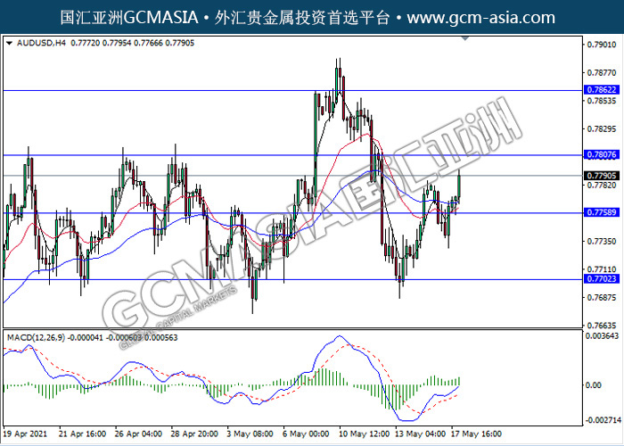 AUDUSD,H4:澳美多头排列,目前靠近前期压力。MACD动能持续略增,若突破可继续看多为主。上方关注0.7805压力和0.7860压力,下方关注0.7760支撑和0.7700支撑。