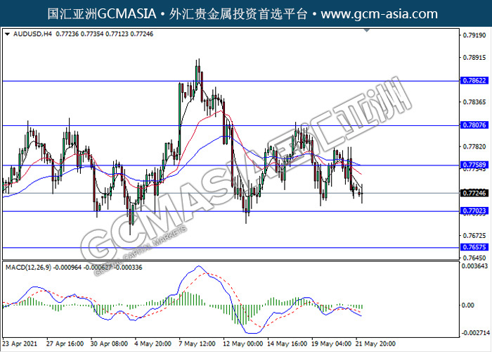 AUDUSD,H4:澳美高位承压回落,目前测试靠近前期支撑。MACD动能略减,若突破继续看空为主。上方关注0.7760压力和0.7805压力,下方关注0.7700支撑和0.7655支撑。