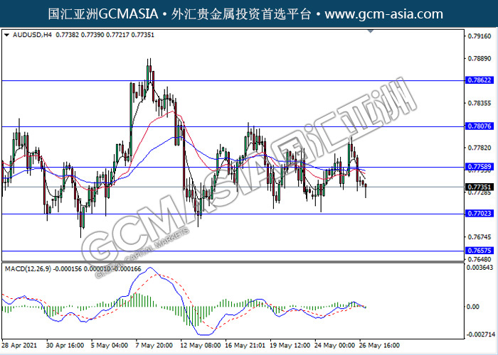 20210527 AUDUSD-午间 by keyk | May 27, 2021 | 澳元兑美元 | 0 comments GCMAsia-AUDUSD AUDUSD 2021-05-27 AUDUSD,H4:突破前期支撑,空头排列。MACD形成死叉,动能略减,短期可继续看空为主。上方关注0.7760压力和0.7805压力,下方关注0.7700支撑和0.7655支撑。