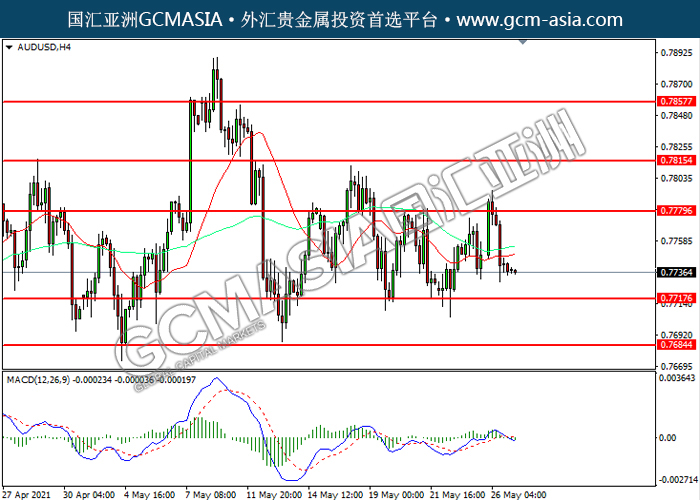 20210527 AUDUSD by willy | May 27, 2021 | 澳元兑美元 | 0 comments GCMAsia-AUDUSD AUDUSD 2021-05-27 AUDUSD,H4:澳美高位回落。MACD已形成死叉,动能转弱,短期可关注空头为主。上方关注0.7780压力和0.7815压力,下方关注0.7715支撑和0.7685支撑。