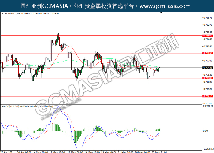 20210601 AUDUSD by willy | Jun 1, 2021 | 澳元兑美元 | 0 comments GCMAsia-AUDUSD AUDUSD 2021-06-01 AUDUSD,H4:澳美震荡上行。MACD多头动能略增,短期可关注多头为主。上方关注0.7805压力和0.7880压力,下方关注0.7700支撑和0.7620支撑。