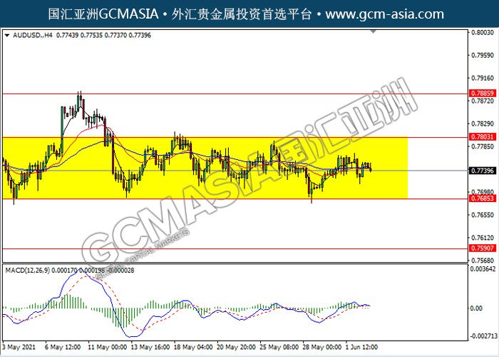 AUDUSD,H4:澳美仍区间震荡盘整。然而,MACD显示空头信号,动能略减,短期可关注空头方向为主。上方关注0.7805压力和0.7885压力,下方关注0.7685支撑和0.7590支撑。