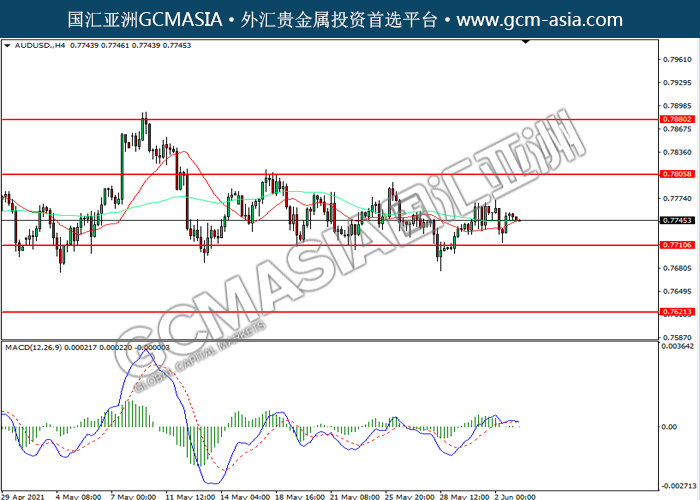 20210603 AUDUSD by willy | Jun 3, 2021 | 澳元兑美元 | 0 comments GCMAsia-AUDUSD AUDUSD 2021-06-03 AUDUSD,H4:澳美震荡上行。然而,MACD多头动能略减,短期可关注技术性回调为主。上方关注0.7805压力和0.7880压力,下方关注0.7710支撑和0.7620支撑。