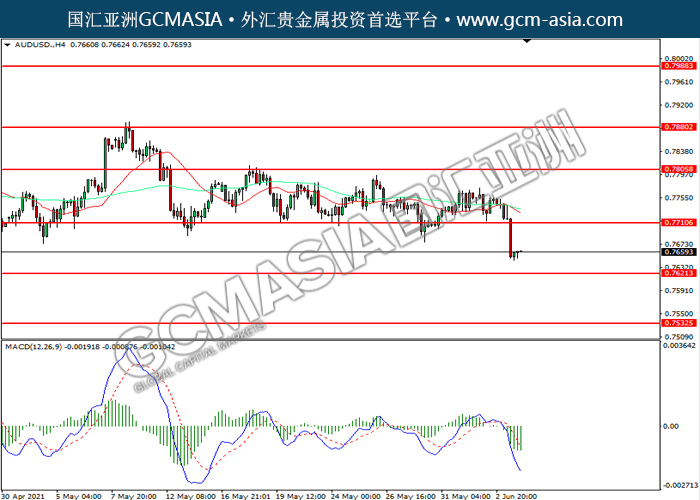20210604 AUDUSD by willy | Jun 4, 2021 | 澳元兑美元 | 0 comments GCMAsia-AUDUSD AUDUSD 2021-06-04 AUDUSD,H4:澳美下破前期支撑,震荡下行。MACD空头动能略增,短期可关注空头为主。上方关注0.7710压力和0.7805压力,下方关注0.7620支撑和0.7535支撑。
