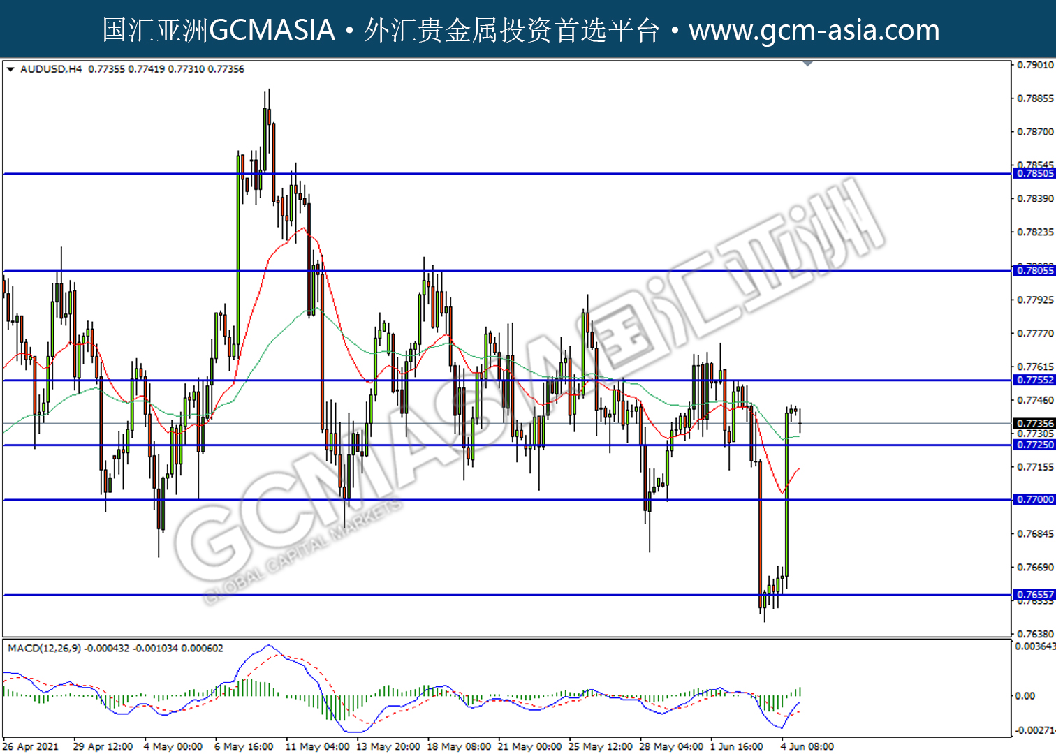 20210607-AUDUSD by willy | Jun 7, 2021 | 澳元兑美元 | 0 comments AUDUSD,H4:澳美低位反弹。MACD已形成金叉,短期可关注多头为主。上方关注0.7755压力和0.7805压力,下方关注0.7725支撑和0.7700支撑。