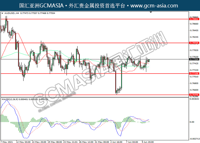 20210611 AUDUSD by willy | Jun 11, 2021 | 澳元兑美元 | 0 comments GCMAsia-AUDUSD AUDUSD,H4:澳美震荡上行。MACD多头动能略增,短期可关注多头为主。上方关注0.7805压力和0.7880压力,下方关注0.7710支撑和0.7645支撑。