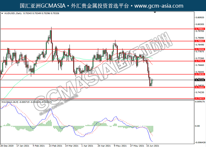 20210622 AUDUSD by willy | Jun 22, 2021 | 澳元兑美元 | 0 comments AUDUSD,Daily:澳美低位反弹。MACD空头动能略减,短期可关注多头为主。上方关注0.7585压力和0.7700压力,下方关注0.7465支撑和0.7365支撑。
