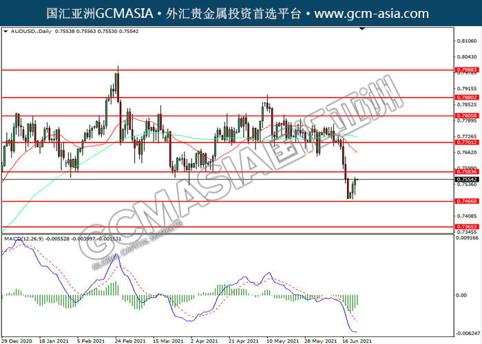 20210623 AUDUSD by willy | Jun 23, 2021 | 澳元兑美元 | 0 comments AUDUSD,Daily:澳美低位反弹,目前测试前期压力。MACD空头动能略减,若突破可关注多头为主。上方关注0.7585压力和0.7700压力,下方关注0.7465支撑和0.7365支撑。
