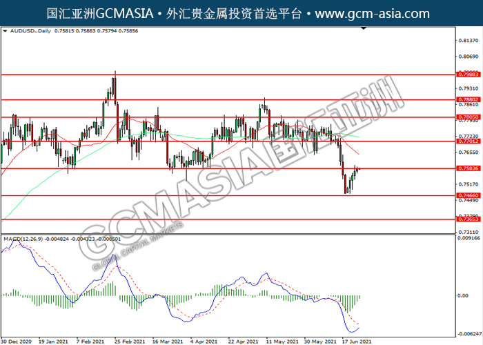 20210625 AUDUSD by willy | Jun 25, 2021 | 澳元兑美元 | 0 comments AUDUSD,Daily:澳美低位反弹,目前测试前期压力。MACD空头动能略减,若突破可关注多头为主。上方关注0.7585压力和0.7700压力,下方关注0.7465支撑和0.7365支撑。