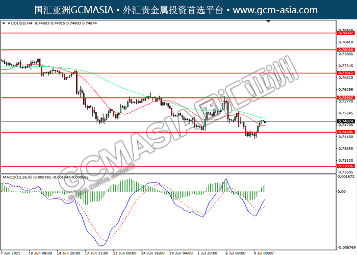 20210712 AUDUSD by willy | Jul 12, 2021 | 澳元兑美元 | 0 comments AUDUSD,H4:澳美震荡上行。MACD多头动能略增,短期可关注多头为主。上方关注0.7590压力和0.7700压力,下方关注0.7440支撑和0.7285支撑。