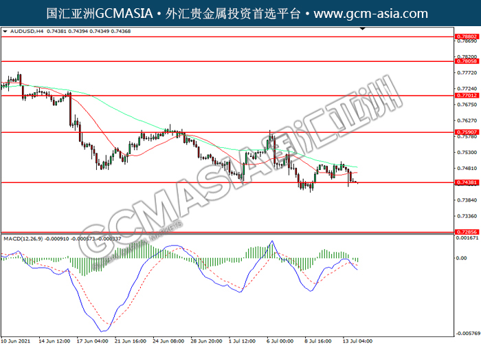 20210714 AUDUSD by willy | Jul 14, 2021 | 澳元兑美元 | 0 comments AUDUSD,H4:澳美震荡下行。MACD空头动能略增,短期可关注空头为主。上方关注0.7590压力和0.7700压力,下方关注0.7440支撑和0.7285支撑。