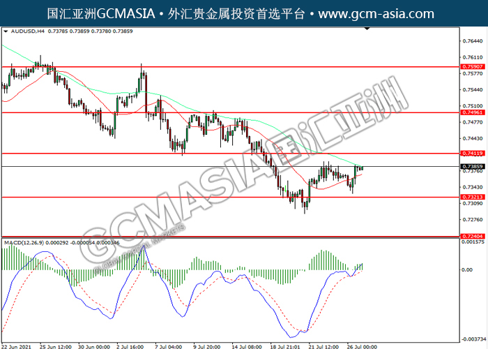 20210727 AUDUSD by willy | Jul 27, 2021 | 澳元兑美元 | 0 comments AUDUSD,H4:澳美震荡上行。MACD多头动能略增,短期可关注多头为主。上方关注0.7410压力和0.7495压力,下方关注0.7320支撑和0.7240支撑。